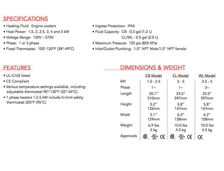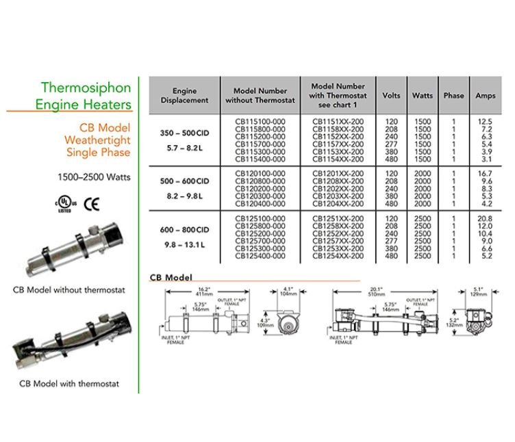 HOTSTART CB models, are a coolant preheaters developed to maintain optimal temperatures for diesel and gas engines, construction equipment, trucks, heavy duty mobile equipment, marine and industrial applications. HOTSTART engine heaters maintain an engine’s operating temperature during downtime and serve as an excellent cold weather or emergency starting aid while eliminating needless idling. HOTSTART CB models circulate heated coolant using the thermosiphon principle, a method of passive heat exchange which circulates a fluid without the necessity of a mechanical pump.